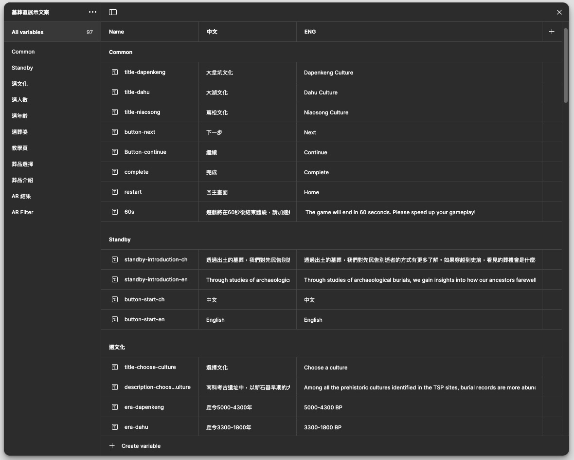 根據展櫃體驗架構,開始進行墓葬組合與 Wireframe 進行開發,從元件設計、色彩規劃、Prototype製作、多語系設定。