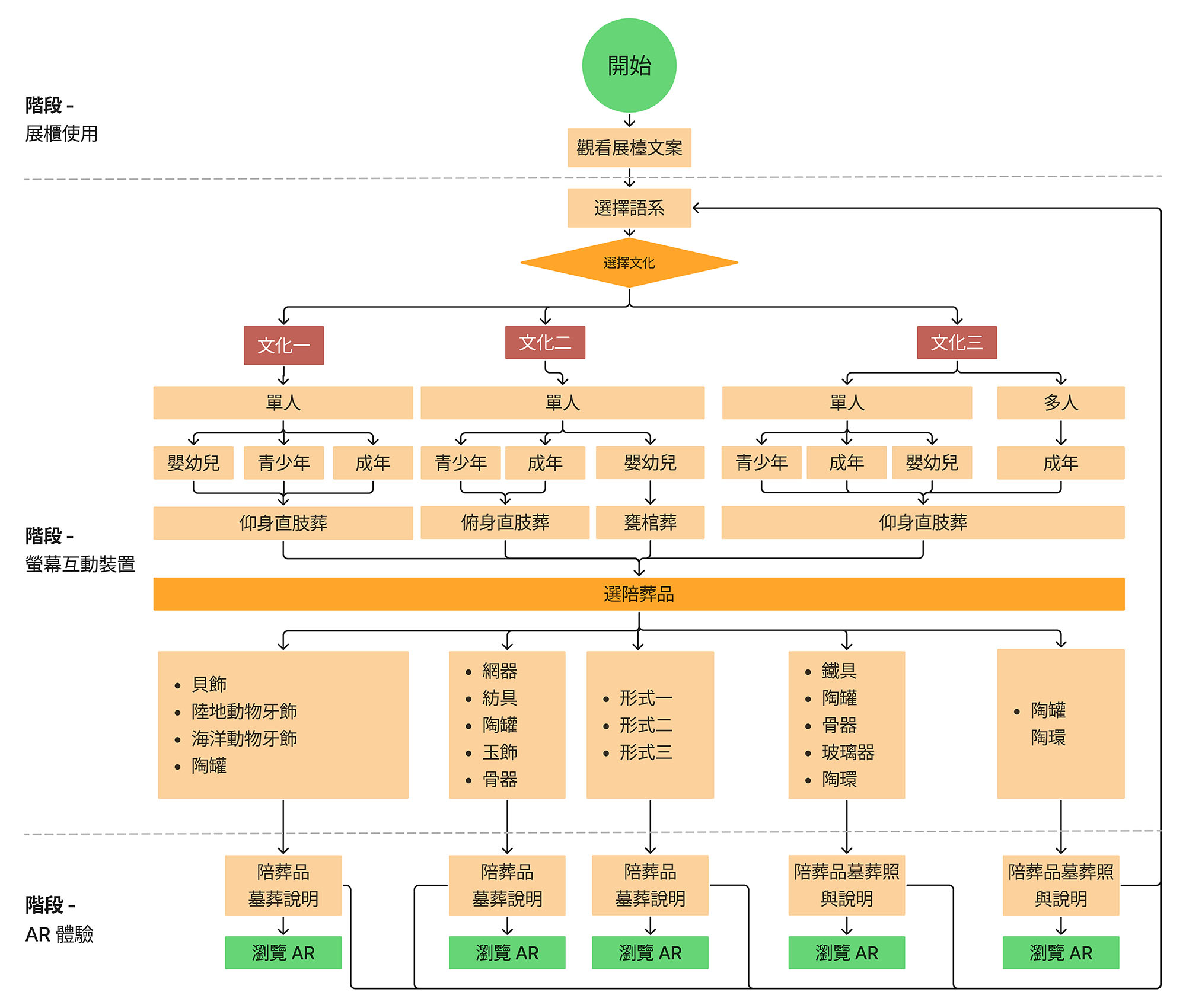 🏛️ 博物館互動 AR 展櫃體驗執行過程① 觀展需求本頁導覽① 觀展需求 用戶訪談 我們深入了解館方需求和搜集資料,並歸納幾個關鍵痛點。 需求 墓葬知識容易參與並傳達知識。 體驗時間限制,滿足場館動線流暢。 博物館屬於服務性質,重視無障礙族群的感受。 需考量館方維運人員的性質與日常工作習慣,需利於維護。 田野調查 帶領工程團隊到現場了解場館使用狀況,用以規劃與設計展櫃。 博物館田野調查 ( 圖片來源:麥脆科技 ) 展櫃體驗流程 主要分為三階段:平面文字閱讀 ➙ 螢幕操作 ➙ AR 互動觀賞。 使用者田野調查 ( 圖片來源:麥脆科技 )